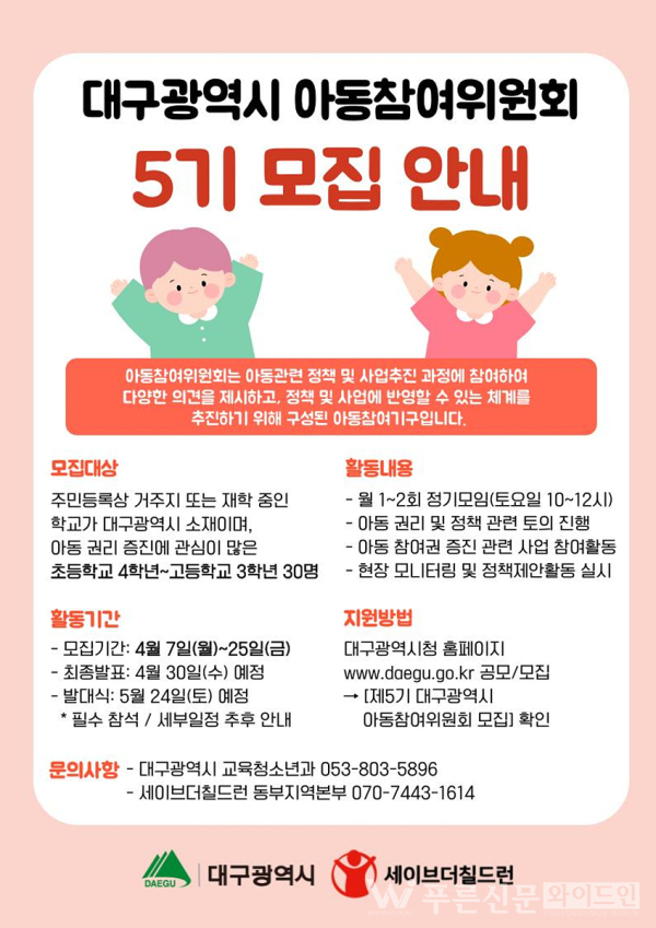 대구광역시는 제5기 아동참여위원회 운영을 위한 아동·청소년 위원을 4월 7일(월)부터 4월 25일(금)까지 공개 모집한다고 말했다.