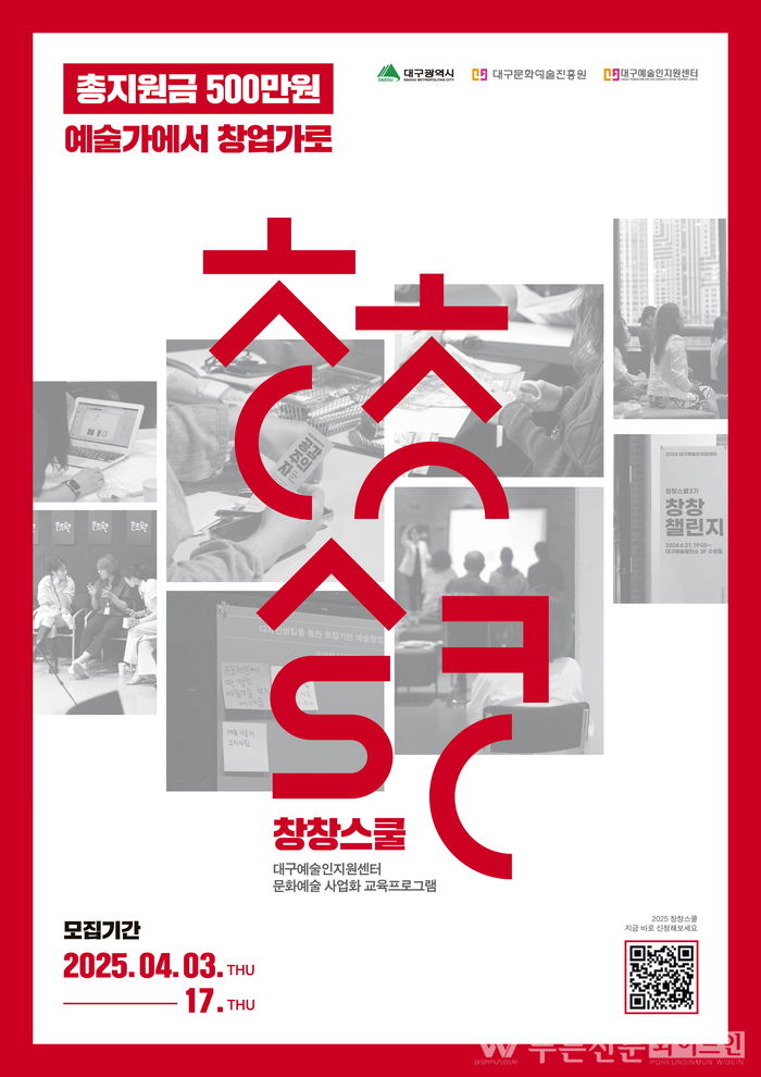 대구문화예술진흥원(원장 박순태, 이하 ‘진흥원’)은 대구 예술인이 급변하는 예술환경 변화에 적극적으로 대응할 수 있도록 문화예술 분야 특화 비즈니스 교육프로그램인 ‘창창스쿨’참여자를 4월 3일(목)~17일(목)까지 모집한다.