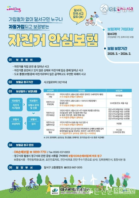 *자전거 이용 중 발생할 수 있는 사고에 대비해 구민의 부담을 줄이고, 친환경 교통수단 확산을 유도하기 위해 2022년부터 추진해온 정책이다. 자전거 안심보험은 자전거 사고로 인한 진단, 입원, 후유장해, 사망 및 벌금 등을 보장하는 제도로, 별도의 신청 없이 달서구에 주민등록이 되어 있는 모든 구민이 자동 가입된다. 등록 외국인도 포함되며, 사고가 타 지역에서 발생하더라도 보장을 받을 수 있다.