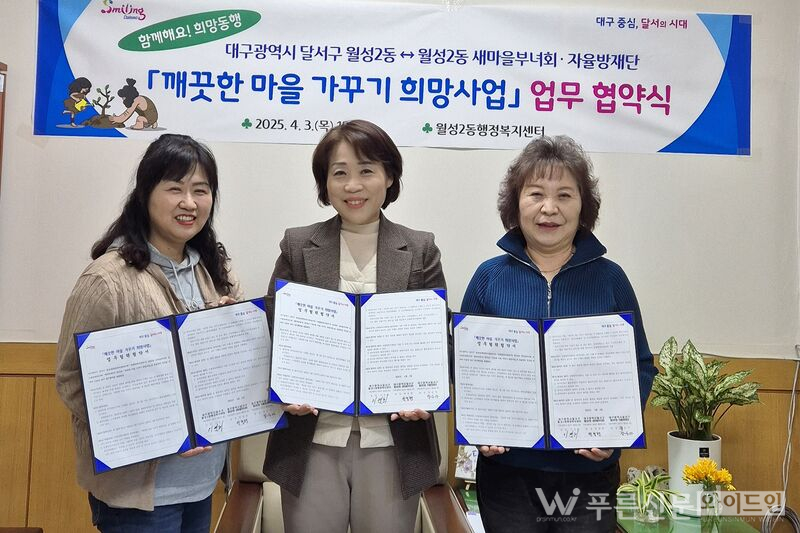 대구 달서구 월성2동 행정복지센터(동장 이연희)는 지난 3일 행정복지센터회의실에서 새마을부녀회와 자율방재단과 함께 「깨끗한 마을 가꾸기 희망사업」 추진을 위한 업무협약(MOU)을 체결했다.