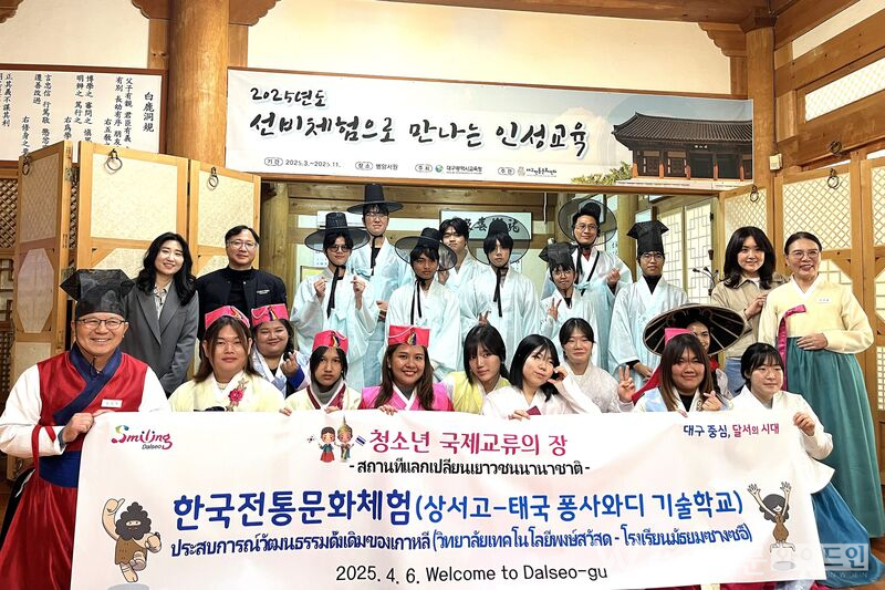 대구 달서구(구청장 이태훈)는 지난 6일 병암서원에서 달서구 상서고와 태국 친선결연학교인 퐁사와디 기술학교 학생들을 대상으로 ‘글로벌 청소년 한국전통문화체험’ 행사를 진행했다고 밝혔다. 이번 행사는 한국 전통문화를 직접 체험하며 상호 문화 이해를 넓히고, 청소년 간 국제 우정을 나누는 기회를 제공하고자 마련됐다.