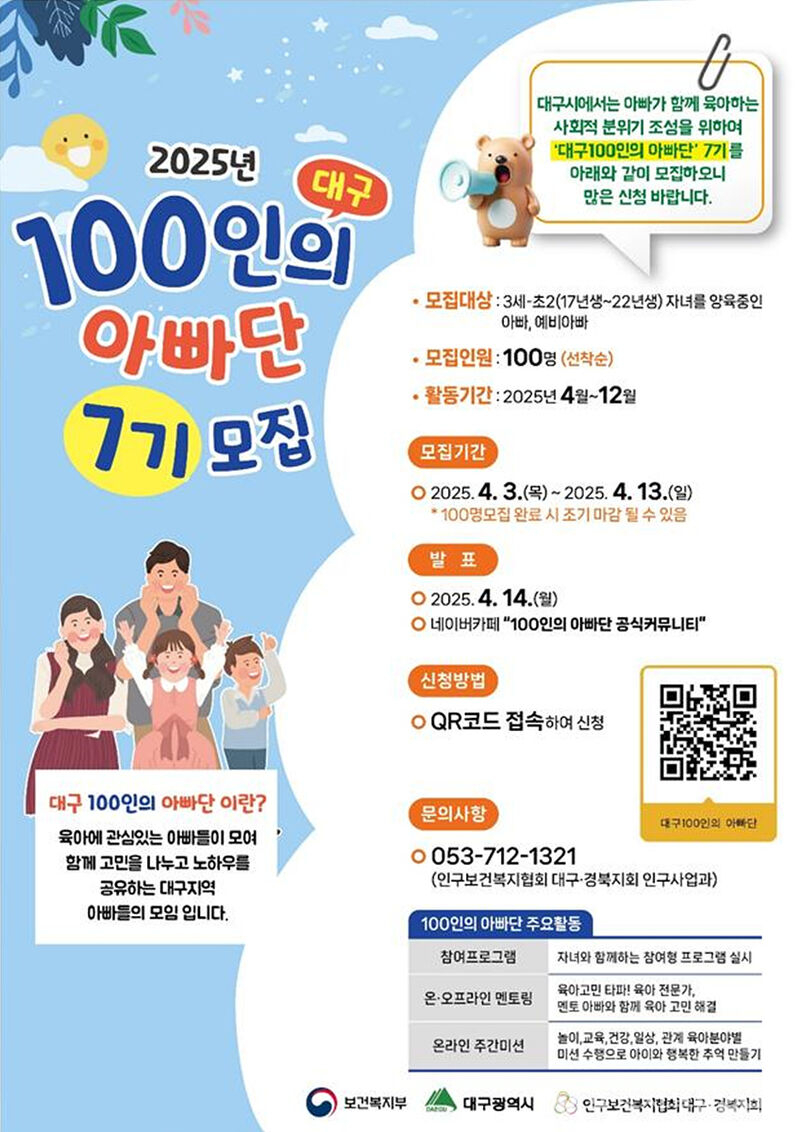 대구광역시와 인구보건복지협회 대구경북지회는 부부가 함께하는 육아 문화 확산을 위해 2025년 7기 ‘대구 100인의 아빠단’ 활동단원 100명을 4월 13일(일)까지 모집한다고 밝혔다.