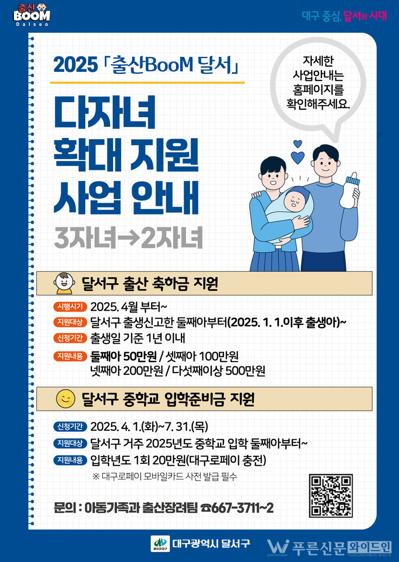 대구 달서구(구청장 이태훈)는 초저출산 위기의 전략적 대응을 위한 '출산BooM 달서' 프로젝트 일환인 다자녀 지원사업을 대폭 확대하여, 출산축하금과 중학생 입학준비금 지원 대상을 4월부터 둘째아로 확대 시행한다.