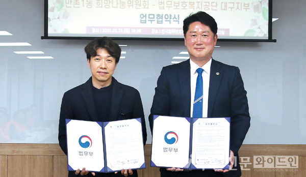 한국법무보호복지공단 대구지부(지부장 임동문)는 지난달 25일(화) 대구지부 2층 대회의실에서 만촌1동 희망나눔위원회(위원장 이효현)와 업무협약을 체결했다.