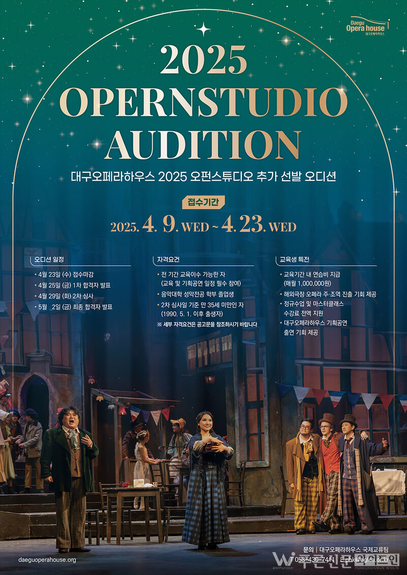 (재)대구문화예술진흥원 대구오페라하우스는 ‘2025 오펀스튜디오’에 참여할 역량 있는 성악가 추가 선발 오디션을 진행하고, 오는 4월 9일(수)부터 23일(수)까지 신청받는다고 말했다.