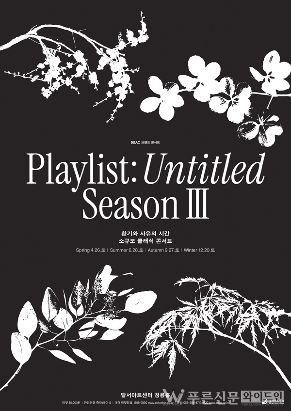 (재)달서문화재단 달서아트센터(관장 이성욱)는 대표 브랜드 콘서트 ‘Playlist : Untitled’ 시즌3을 오는 4월 26일(토)을 시작으로 6월 28일(여름) △ 9월 27일(가을)△ 12월 20일(겨울)까지 총 4회에 걸쳐 선보인다.