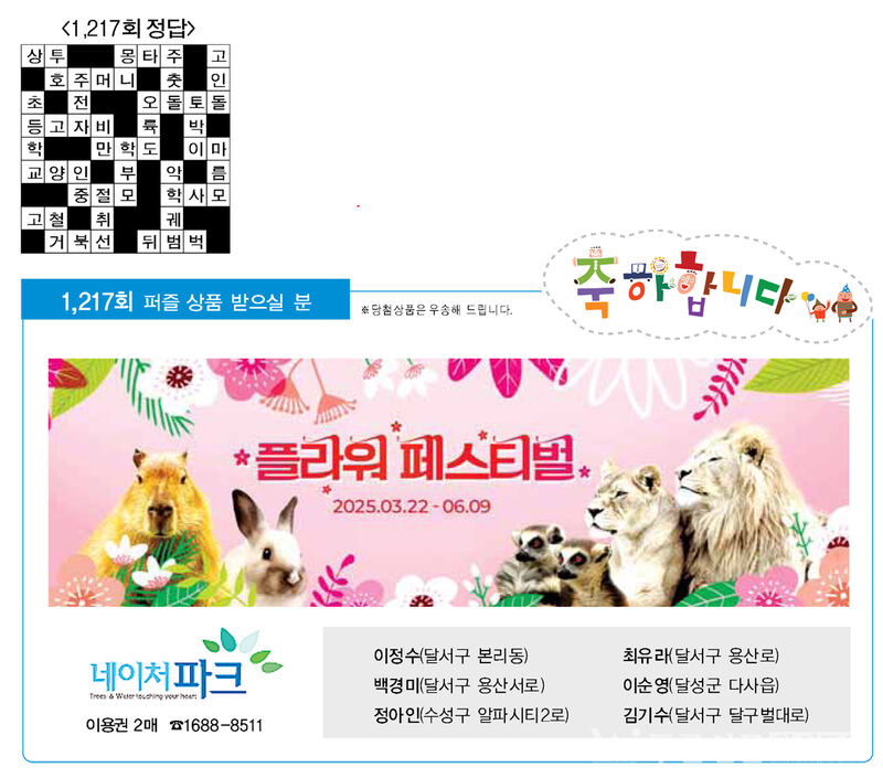 ♣ ‘가족과 함께 풀어보세요’정답을 아시는 분은 본사 편집부로 보내주시기 바랍니다. 5월 13일(화)까지 도착된 엽서 중에서 추첨을 통해 상품을 드립니다. 주소를 정확히 기재해 주십시오. 당첨상품을 우송해 드립니다.