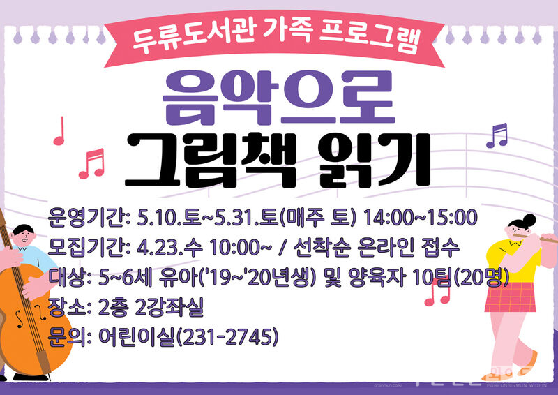 대구두류도서관(관장 신경아) 어린이실에서는 5월 가정의 달을 맞이해 가족 프로그램인 ‘음악으로 그림책 읽기’를 운영한다. 도서관 누리집을 통해 참여할 5~6세 유아와 양육자 10가족(20명)을 모집하고 있다.