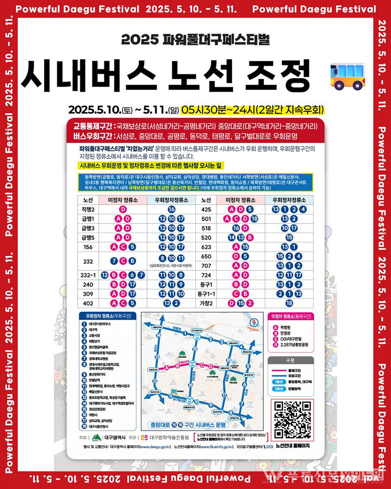 대구광역시가 오는 5월 10일(토)부터 5월 12일(월) 오전 5시까지 개최되는 ‘2025 파워풀대구페스티벌’ 기간 동안 국채보상로(서성네거리~공평네거리) 일대를 전면 통제해 ‘차 없는 거리’로 운영한다.
