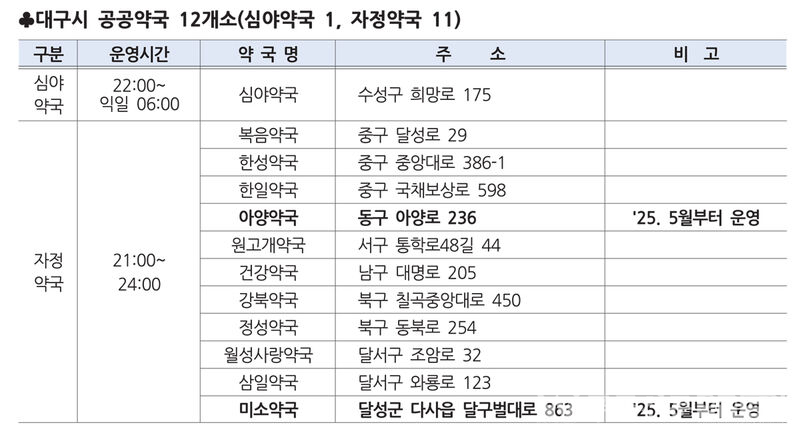 이번, 공공약국 확대 운영으로 심야시간에 운영하는 공공약국이 없던 동구에 아양약국과 달성군에 미소약국이 추가 운영된다.