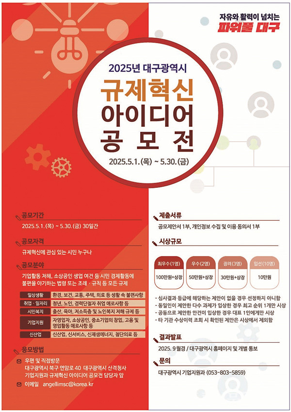 대구광역시는 기업활동과 일상생활에 불편을 주는 각종 규제에 대해 시민이 직접 규제혁신 아이디어를 제안하는 ‘2025년 대구광역시 규제혁신 아이디어 공모전’을 개최한다.