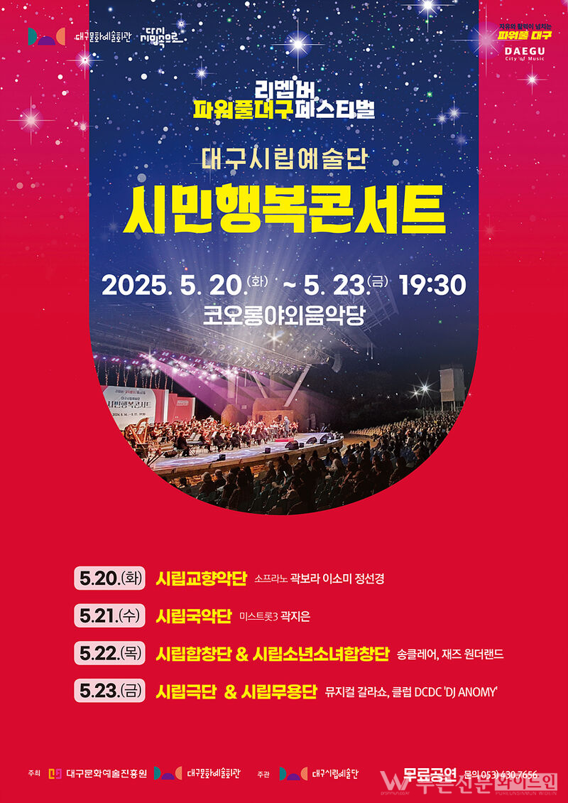 대구시립예술단 6개 단체가 함께하는 <시민행복콘서트- 리멤버! 파워풀대구페스티벌> 5월 20일~23일 4일간 코오롱야외음악당에서 개최