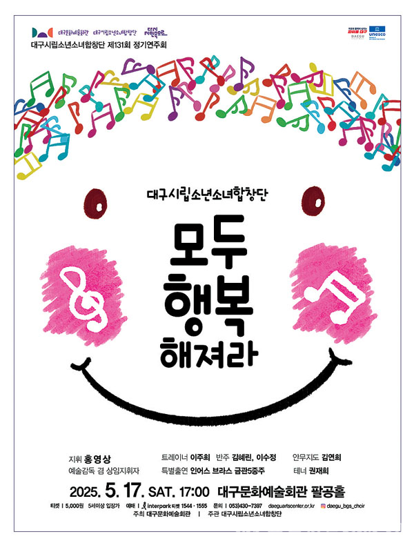 대구시립소년소녀합창단(예술감독 겸 상임지휘자 홍영상)이 5월 17일(토) 오후 5시 대구문화예술회관 팔공홀에서 제131회 정기연주회 ‘모두 행복해져라’를 개최한다.