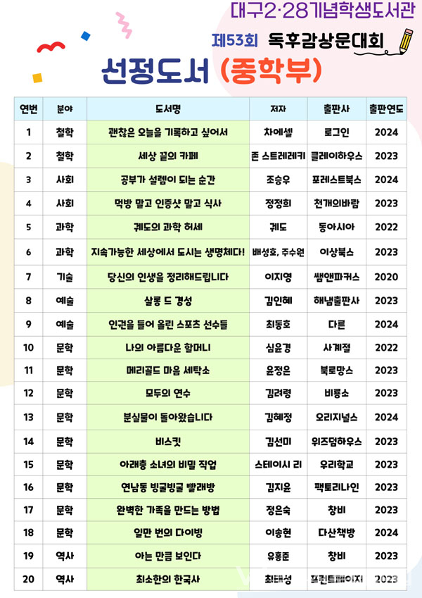 대구2·28기념학생도서관이 지역 청소년들의 독서 습관을 장려하고 글쓰기 능력 향상을 돕기 위해 ‘제53회 독후감상문대회’를 개최한다.