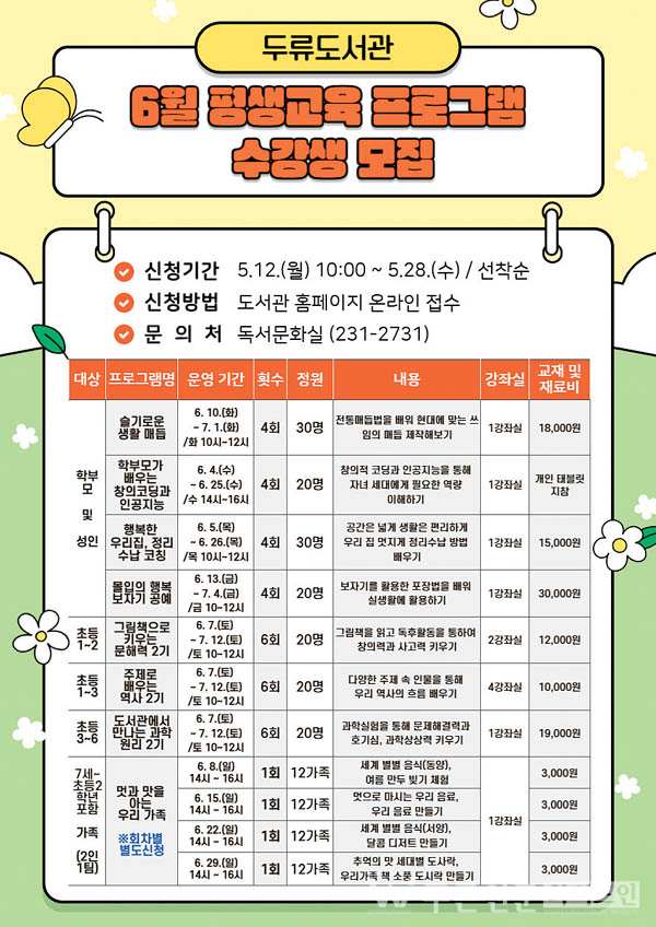 대구두류도서관(관장 신경아)은 6월부터 운영하는 학생, 학부모, 가족 프로그램 수강생을 도서관 누리집을 통해 선착순 모집한다.