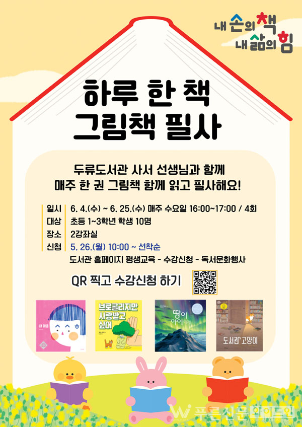 5월 26일(월)부터 모집 중, 프로그램은 6월 4일(수)부터 매주 수요일 총 4회 진행되며, 도서관에서 그림책을 읽고 문장을 필사하는 활동이다.
