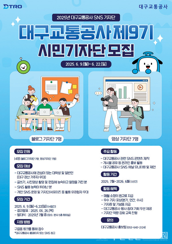 대구교통공사가 도시철도 소식을 전할 ‘제9기 DTRO 시민기자단’을 모집한다. 모집 인원은 블로그 기자단과 영상 기자단 각 7명씩 총 14명이며, 기간은 6월 22일(일)까지다.