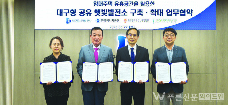 대구도시개발공사는 지난달 22일(목) 한국에너지공단 대구경북본부, (사)누구나햇빛발전, 달구벌시민햇빛발전협동조합과 함께 ‘대구형 공유햇빛발전소’ 구축·확대를 위한 업무협약을 체결했다.