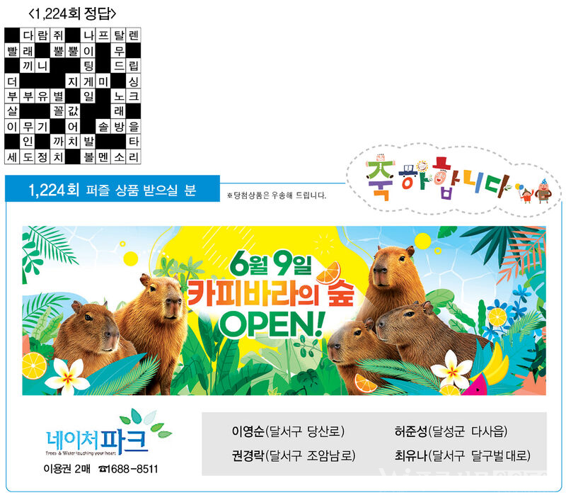 ♣ ‘가족과 함께 풀어보세요’정답을 아시는 분은 본사 편집부로 보내주시기 바랍니다. 7월 1일(화)까지 도착된 엽서 중에서 추첨을 통해 상품을 드립니다. 주소를 정확히 기재해 주십시오. 당첨상품을 우송해 드립니다.