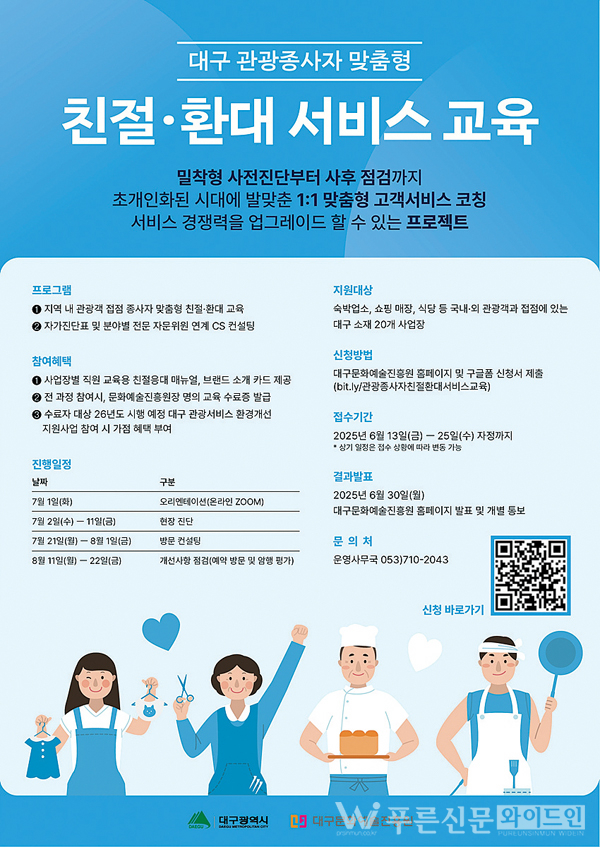 대구광역시와 대구문화예술진흥원은 관광객 접점 사업체를 대상으로 ‘맞춤형 환대 교육’ 참여자를 모집 중이다. 숙박업소, 쇼핑 매장, 식당 등 국내·외 관광객과 접점에 있는 대구 소재 사업체라면 누구나 신청할 수 있다.