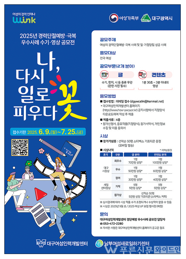 대구광역시는 여성의 경제활동 참여를 촉진하고 경력단절 예방을 위해 ‘2025년 경력단절예방·극복 우수사례’ 공모전 신청을 7월 25일(금)까지 접수한다.