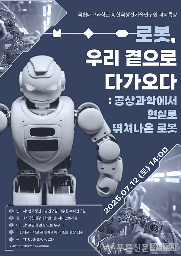 국립대구과학관(관장 이난희)은 7월 12일 오후 2시, 1층 사이언트리홀에서 ‘로봇, 우리 곁으로 다가오다: 공상과학에서 현실로 뛰쳐나온 로봇’을 주제로 과학특강을 연다.