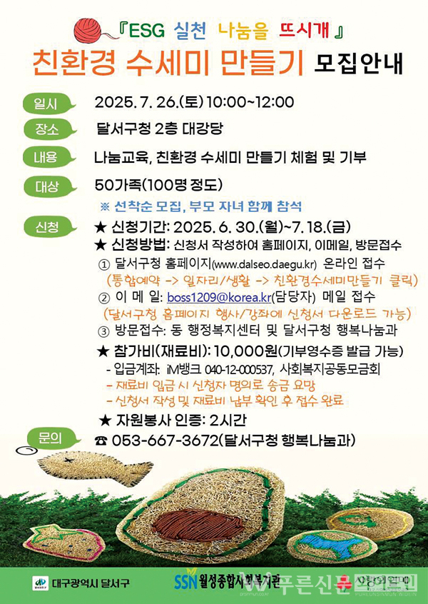 달서구는 오는 7월 26일(금) 달서구청 2층 대강당에서 ‘손뜨개 친환경 수세미 만들기 체험’ 행사를 개최한다.