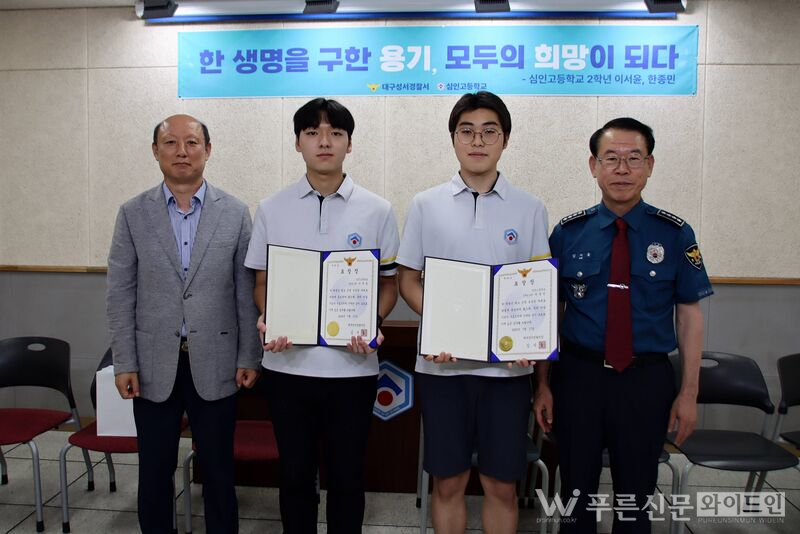 대구성서경찰서(서장 김시동)는 17일 심인고등학교를 방문해 자살을 시도하던 시민을 구조한 고등학생 2명에게 표창장과 신고 포상금을 수여했다고 밝혔다.