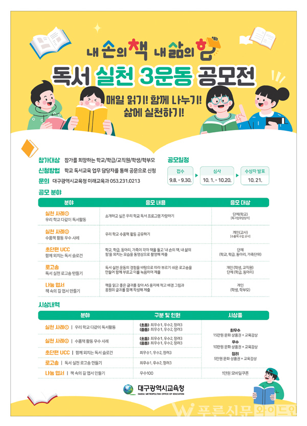 대구시교육청은 여름방학을 맞아 ‘독서하는 대구, 책 읽기와 함께하는 방학’을 주제로 ‘내 손의 책, 내 삶의 힘’ 독서 실천 3운동 공모전을 실시한다.
