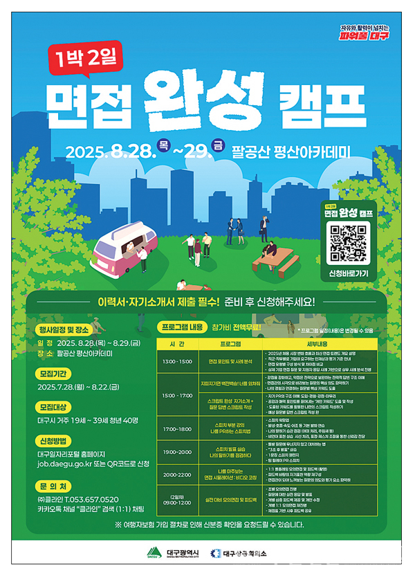 대구광역시는 지역 미취업 청년을 대상으로 ‘1박 2일 면접 완성 캠프’ 참가자를 오는 8월 22일(금)까지 모집한다.