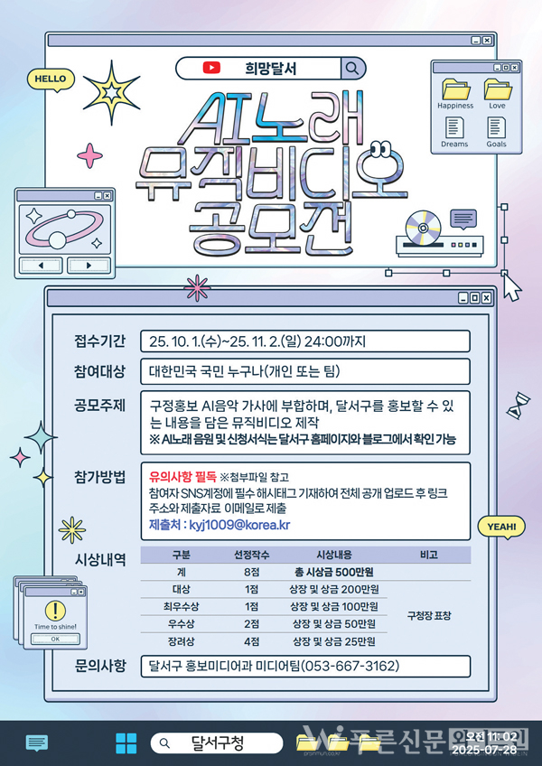 달서구는 지역의 매력을 널리 알리기 위해 11월 2일(일)까지 ‘희망달서 AI노래 뮤직비디오 공모전’을 연다.