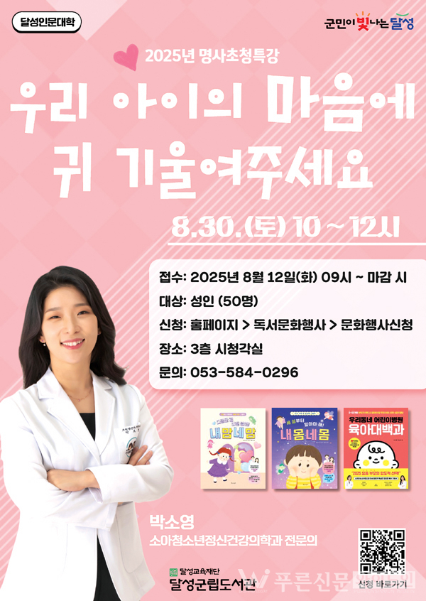 달성군립도서관은 8월 30일(토) 정신건강의학과 전문의 박소영 원장을 초청해 ‘우리 아이의 마음에 귀 기울여 주세요’ 특강을 진행한다.