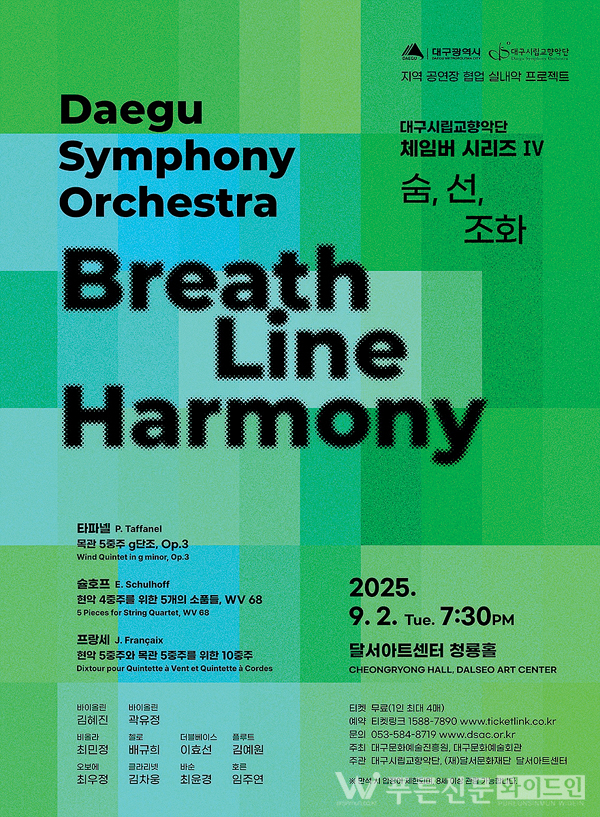 대구시립교향악단은 오는 9월 2일(화) 오후 7시 30분, 달서아트센터 청룡홀에서 실내악 공연 ‘체임버 시리즈 Ⅳ: 숨, 선, 조화’를 개최하며 올해 실내악 프로젝트를 마무리한다.