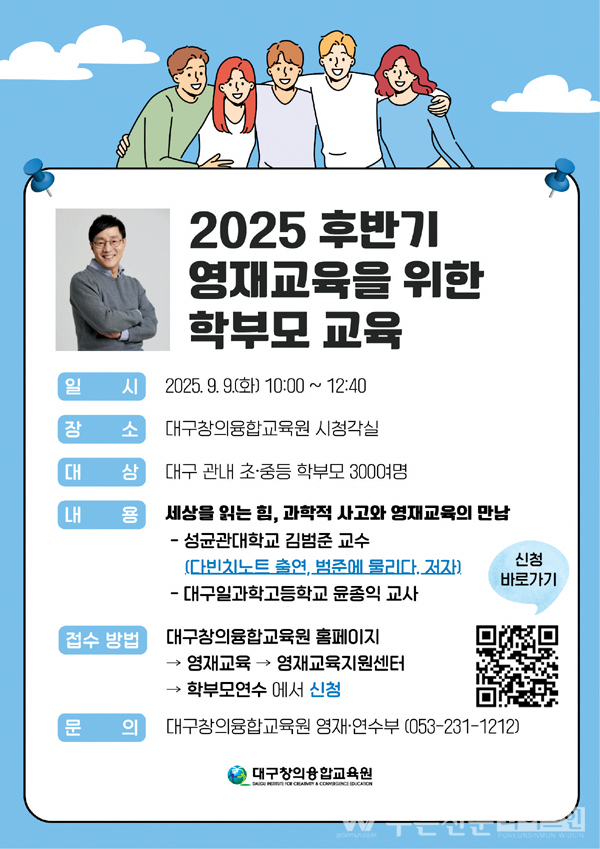 대구창의융합교육원은 오는 9월 9일(화) 개최되는 ‘2025 후반기 영재교육 학부모 대상 특별 강연’에 참여할 초·중등 학부모 300명을 모집한다.