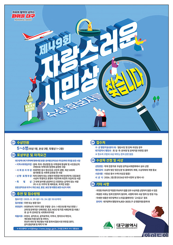 대구시는 지역사회 발전과 선행·봉사에 기여한 시민을 발굴하기 위해 ‘제49회 자랑스러운 시민상’ 후보자를 10월 24일(금)까지 공개 모집한다.
