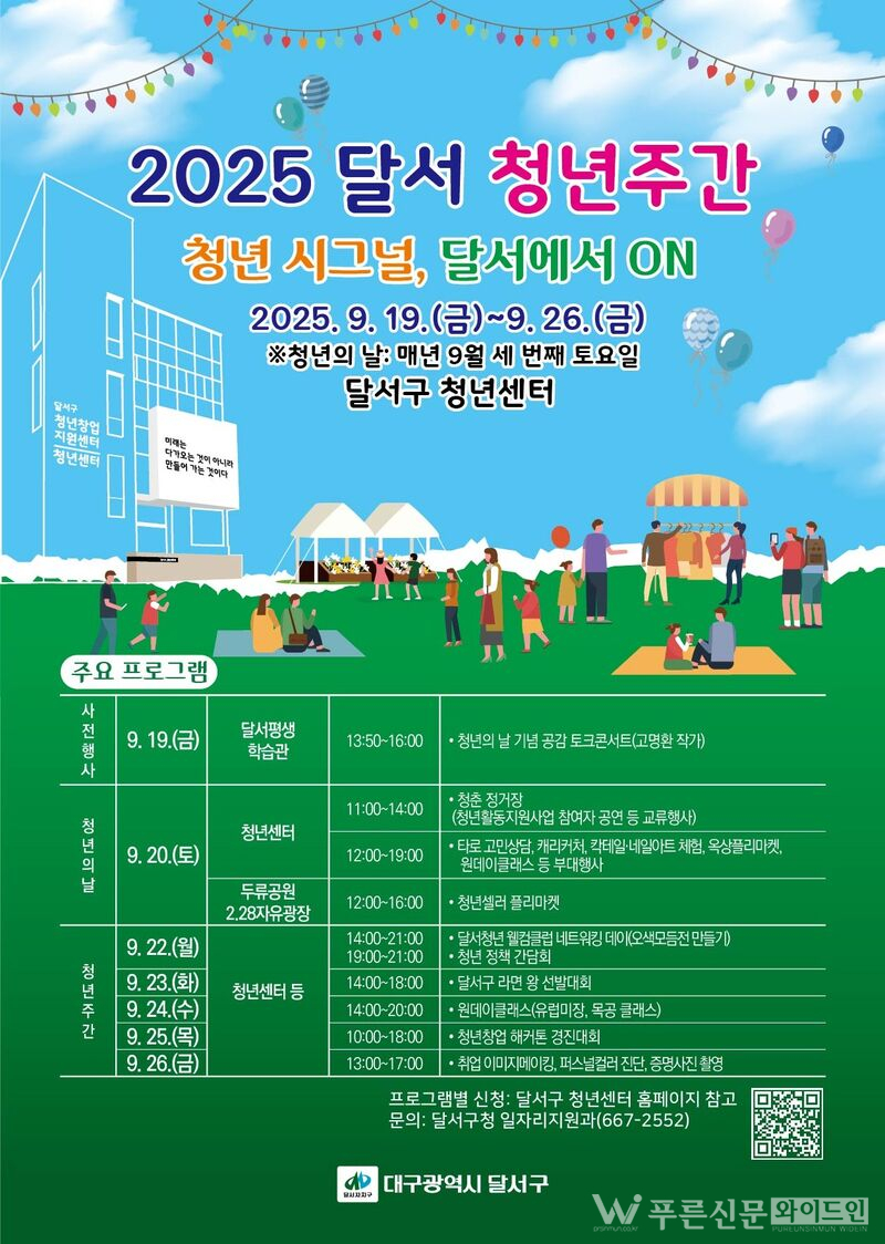 대구 달서구(구청장 이태훈)는 오는 9월 20일 ‘청년의 날’을 맞아 9월 19일부터 26일까지 「2025 달서 청년주간」을 운영한다고 15일 밝혔다.
