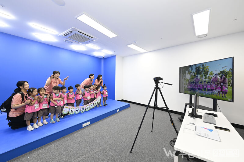 달성어린이숲도서관 3층 가상체험실에서 크로마키를 활용해 아이들이 특별한 체험을 하고 있다. [사진=달성군]