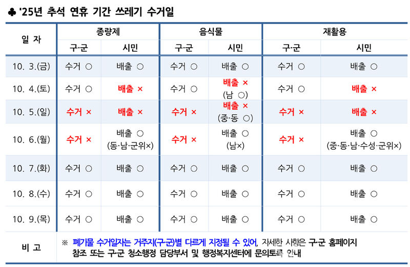 추석 연휴(10월 3일~9일) 동안에는 청소상황실과 기동반을 가동해 쓰레기 수거에 차질이 없도록 할 계획이다. 단, 10월 5일(일)과 추석 당일인 6일(월)에는 쓰레기 수거가 없으므로, 배출일을 반드시 확인해야 한다.