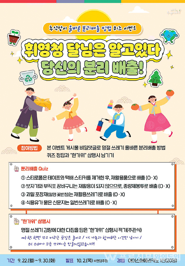 한편, 9월 30일(화)까지 ‘추석맞이 올바른 분리배출 OX 퀴즈 이벤트’를 실시한다. 대구환경이야기 블로그를 통해 참여할 수 있으며, 퀴즈 정답과 쓰레기 감량 삼행시를 남기면 추첨을 통해 커피 쿠폰을 제공한다.