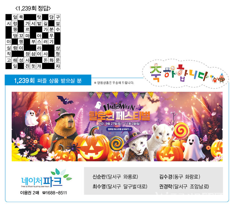 ♣ ‘가족과 함께 풀어보세요’정답을 아시는 분은 본사 편집부로 보내주시기 바랍니다. 10월 28일(화)까지 도착된 엽서 중에서 추첨을 통해 상품을 드립니다. 주소를 정확히 기재해 주십시오. 당첨상품을 우송해 드립니다.