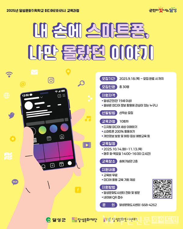 (재)달성문화재단 달성문화도시센터(이사장 최재훈)는 군민들의 디지털 역량 강화를 위해 오는 11월 13일(목)까지 매주 화요일과 목요일, 선비체험관(송해기념관) 2층에서 ‘미디어리터러시 교육과정-내 손에 스마트폰, 나만 몰랐던 이야기’를 운영하며, 수강생을 상시 모집 중이다.