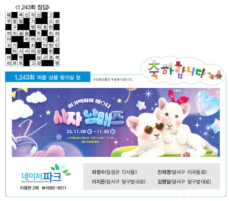 ♣ ‘가족과 함께 풀어보세요’정답을 아시는 분은 본사 편집부로 보내주시기 바랍니다. 11월 25일(화)까지 도착된 엽서 중에서 추첨을 통해 상품을 드립니다. 주소를 정확히 기재해 주십시오. 당첨상품을 우송해 드립니다.