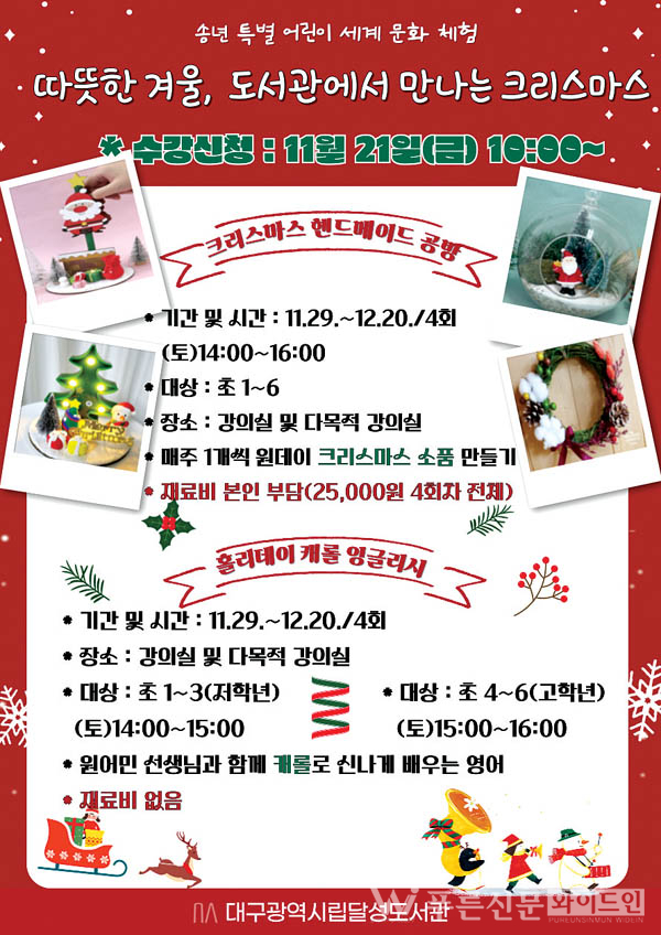 대구달성도서관은 11월 29일(토)~12월 20일(토)까지 매주 토요일 초등학생을 대상으로 ‘송년 특별 어린이 세계 문화 체험_따뜻한 겨울, 도서관에서 만나는 크리스마스’를 운영한다.