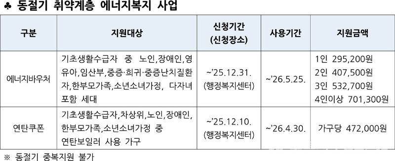 지원 대상은 기초생활수급 가구 중 노인, 영유아, 장애인, 임산부, 중증·희귀질환자, 한부모가족, 소년소녀가정, 다자녀가구 등 조건에 해당하는 세대다. 올해부터는 19세 미만 자녀 2명 이상인 다자녀가구도 포함된다. 신청은 12월 31일(수)까지 가능하다.