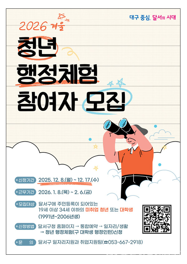 달서구는 2026년 겨울 청년 행정체험 참여자 40명을 모집한다. 모집 기간은 12월 8일(월)~17일(수)까지이며, 대학생과 미취업 청년(19~34세)이 대상이다.