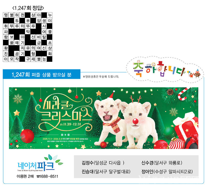 ♣ ‘가족과 함께 풀어보세요’정답을 아시는 분은 본사 편집부로 보내주시기 바랍니다. 12월 23일(화)까지 도착된 엽서 중에서 추첨을 통해 상품을 드립니다. 주소를 정확히 기재해 주십시오. 당첨상품을 우송해 드립니다.