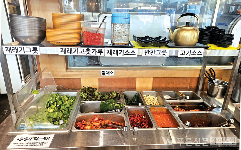 식당에 들어서면 깔끔하게 정리된 2인, 4인, 6인 테이블과 친절한 직원이 반갑게 맞아줍니다. 고기는 테블릿으로 주문하면 되고, 된장과 김도 함께 제공됩니다. 나머지 밥과 반찬은 셀프바에서 원하는 만큼 가져올 수 있습니다.