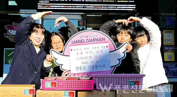반송초등학교 기부동아리(담당 이병두) 학생들이 직접 만든 쿠키 20세트와 라면 등 100만 원 상당의 물품을 옥포읍 행정복지센터에 기부했다.
