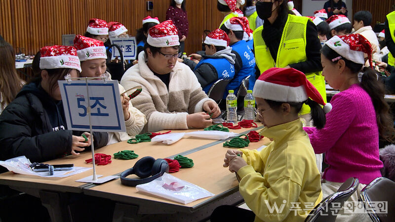 이날 행사장에는 산타 복장을 한 ‘산타 가족’과 중·고등학생, 대학생, 전문 봉사자 등 130여 명이 모여 연말 특유의 따뜻한 분위기를 더했다. 참가자들은 초록색과 빨간색 양말목을 하나하나 엮어 크리스마스 리스를 만들고, 직접 완성한 리스에 간식 세트와 학용품을 담아 정성껏 선물 상자를 꾸렸다.