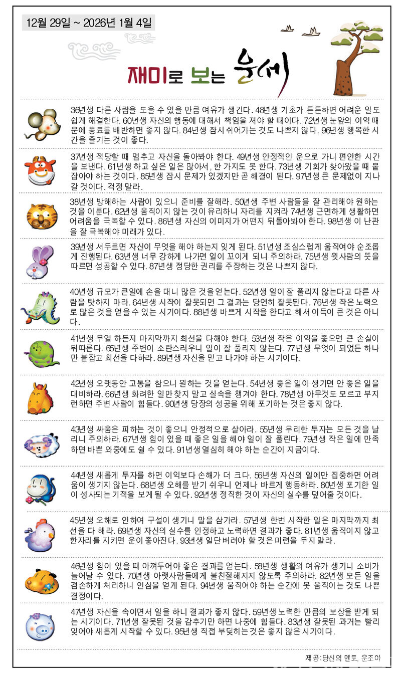 재미로 보는 운세(12월 29일~2026년 1월 4일)